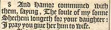 8 And Hamor communed with them, saying, The soule of my sonne Shechem longeth for your daughter: I pray you giue her him to wife.