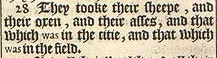 28 They tooke their sheepe, and their oxen, and their asses, and that which was in the citie, and that which was in the field.