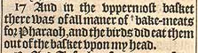 17 And in the vppermost basket there was of all maner of +bake-meats for Pharaoh, and the birds did eat them out of the basket vpon my head. [+Hebr. meat of Pharaoh, the worke of a baker, or cooke. ]