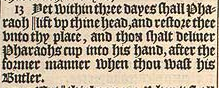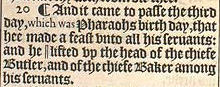 20 ¶ And it came to passe the third day, which was Pharaohs birth day, that hee made a feast vnto all his seruaunts: and he || lifted vp by the head of the chiefe Butler, and of the chiefe Baker among his seruants. [ || Or, reckoned. ]