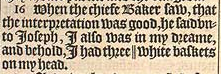 16 When the chiefe Baker saw, that the interpretation was good, he said vnto Ioseph, I also was in my dreame, and behold, I had three ||white baskets on my head. [ || Or, full of holes.]