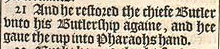 21 And he restored the chiefe Butler vnto his Butlership againe, and hee gaue the cup into Pharaohs hand.