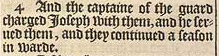 4 And the captaine of the guard charged Ioseph with them, and he serued them, and they continued a season in warde.