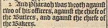 2 And Pharaoh was wroth against two of his officers, against the chiefe of the Butlers, and against the chiefe of the Bakers.