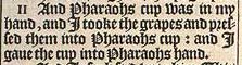 11 Und Pharaos Becher war in meiner Hand und ich nahm die Trauben und presste sie in Pharaos Becher: Und ich gab den Becher in Pharaos Hand.”