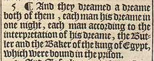 5 ¶ And they dreamed a dreame both of them, each man his dreame in one night, each man according to the interpretation of his dreame, the Butler and the Baker of the king of Egypt, which were bound in the prison.