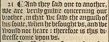 21 ¶ And they said one to another, We are verily guiltie concerning our brother, in that we saw the anguish of his soule, when he besought vs, and we would not heare: therefore is this distresse come vpon vs.