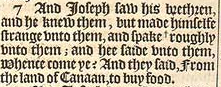 7 And Ioseph saw his brethren, and he knew them, but made himselfe strange vnto them, and spake +roughly vnto them; and hee saide vnto them, Whence come ye? And they said, From the land of Canaan, to buy food. [ +Hebr. hard things with them. ]