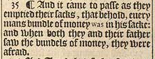 35 ¶ And it came to passe as they emptied their sacks, that behold, euery mans bundle of money was in his sacke: and when both they and their father saw the bundels of money, they were afraid.