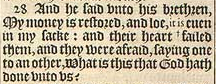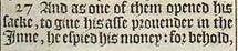 27 And as one of them opened his sacke, to giue his asse prouender in the Inne, he espied his money: for behold, it was in his sackes mouth.