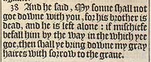 38 And he said, My sonne shall not goe downe with you, for his brother is dead, and he is left alone: if mischiefe befall him by the way in the which yee goe, then shall ye bring downe my gray haires with sorrow to the graue.
