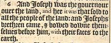 6 Und Joseph war der Gouverneur über das Land und er war es, der an die ganzen Leute des Landes verkaufte: Und Josephs Brüder kamen und verbeugten sich vor ihm, mit Ihren Gesichtern zur Erde.