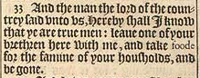 33 And the man the lord of the countrey said vnto vs, Hereby shall I know that ye are true men: leaue one of your brethren here with me, and take foode for the famine of your housholds, and be gone.