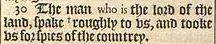 30 The man who is the lord of the land, spake +roughly to vs, and tooke vs for spies of the countrey. [ + Hebr. with vs hard things. ]