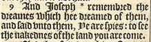 9 And Ioseph *remembred the dreames which hee dreamed of them, and said vnto them, Ye are spies: to see the nakednes of the land you are come. [ *Chap.37. 5. ]