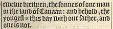 32 We be twelue brethren, sonnes of our father: one is not, and the yongest is this day with our father, in the land of Canaan.