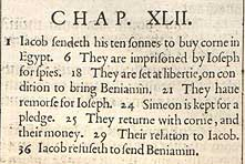 1 Jakob schickt seine zehn Söhne, Getreide in Ägypten zu kaufen. 6 Sie werden von Josephs Leuten als Spione inhaftiert. 18 Sie werden freigelassen, unter Bedingung Benjamin herbeizubringen. 21 Sie haben ein schlechtes Gewissen vor Joseph. 24 Simeon wird als Pfand behalten. 25 Sie kehren mit Getreide und ihrem Geld zurück. 29 IOhr Verhältnis zu Jakob. 36 Jakob weigert sich Benjamin zu schicken.