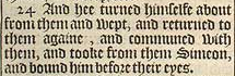 24 And hee turned himselfe about from them and wept, and returned to them againe, and communed with them, and tooke from them Simeon, and bound him before their eyes.