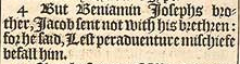 4 But Beniamin Iosephs brother, Iacob sent not with his brethren: for he said, Lest peraduenture mischiefe befall him.