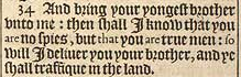 34 And bring your yongest brother vnto me: then shall I know that you are no spies, but that you are true men: so will I deliuer you your brother, and ye shall traffique in the land.
