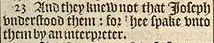 23 And they knew not that Ioseph vnderstood them: for +hee spake vnto them by an interpreter. [ +Hebr. an interpreter was betweene them. ]