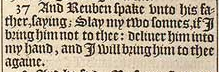 37 And Reuben spake vnto his father, saying; Slay my two sonnes, if I bring him not to thee: deliuer him into my hand, and I will bring him to thee againe.