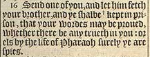 16 Send one of you, and let him fetch your brother, and ye shalbe +kept in prison, that your wordes may be proued, whether there be any trueth in you: or els by the life of Pharaoh surely ye are spies. [ + Heb. bound ]