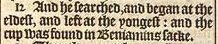 12 And he searched, and began at the eldest, and left at the yongest: and the cup was found in Beniamins sacke.