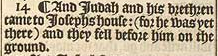 14 ¶ And Iudah and his brethren came to Iosephs house: (for he was yet there) and they fell before him on the ground.