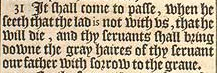 31 Soll es geschehen, als er sah, dass der Junge nicht mit uns ist, dass er sterben wird und deine Diener sollen die grauen Haare deines Dieners, unseres Vaters, mit Leid zu Grave tragen.