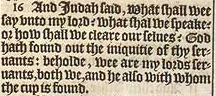 16 And Iudah said, What shall wee say vnto my lord? what shal we speake? or how shall we cleare our selues? God hath found out the iniquitie of thy seruants: beholde, wee are my lords seruants, both we, and he also with whom the cup is found.
