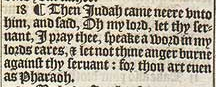 18 ¶ Then Iudah came neere vnto him, and said, Oh my lord, let thy seruant, I pray thee, speake a word in my lords eares, & let not thine anger burne against thy seruant: for thou art euen as Pharaoh.