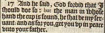 17 And he said, God forbid that I should doe so: but the man in whose hand the cup is found, he shal be my seruant; and as for you, get you vp in peace vnto your father.