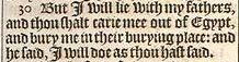 30 But I will lie with my fathers, and thou shalt carie mee out of Egypt, and bury me in their burying place: and he said, I will doe as thou hast said.
