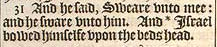 31 And he said, Sweare vnto mee: and he sware vnto him. And *Israel bowed himselfe vpon the beds head. [ * Heb.11. 21.]