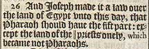 26 And Ioseph made it a law ouer the land of Egypt vnto this day, that Pharaoh should haue the fift part: except the land of the || priests onely, which became not Pharaohs. [ || Or, Princes ]