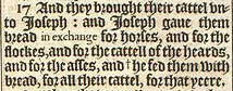 17 And they brought their cattel vnto Ioseph: and Ioseph gaue them bread in exchange for horses, and for the flockes, and for the cattell of the heards, and for the asses, and +he fed them with bread, for all their cattel, for that yeere. [ +Heb. led them.]