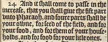 24 And it shall come to passe in the increase, that you shall giue the fift part vnto Pharaoh, and foure parts shall be your owne, for seed of the field, and for your food, and for them of your households, and for food for your litle ones.