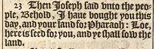 23 Then Ioseph said vnto the people, Behold, I haue bought you this day, and your land for Pharaoh: Loe, here is seed for you, and ye shall sow the land.