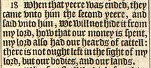 18 When that yeere was ended, they came vnto him the second yeere, and said vnto him, We will not hide it from my lord, how that our money is spent, my lord also had our heards of cattell: there is not ought left in the sight of my lord, but our bodies, and our lands.