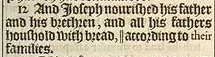 12 And Ioseph nourished his father and his brethren, and all his fathers houshold with bread, || according to their families. [ || Or, as a litle childe is nourished. Heb. according to the little ones. ]