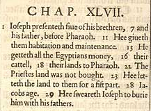 1 Joseph präsentiert fünf seiner Brüder 7 und seinen Vater dem Pharao. 11 Er gibt ihnen Unterkunft und Unterhalt. 13 Er erwirbt das Geld aller Ägypter, 16 ihr Vieh, 18 ihr Land für Pharao. 212 Das Land der Priester wurde nicht gekauft. 23 Er überlässt ihnen das Land für ein Fünftel. 28 Jakobs Alter. 29 Er schwört Joseph, ihn mit seinen Vätern zu begraben.