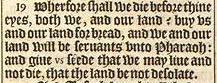 19 Wherfore shall we die before thine eyes, both we, and our land? buy vs and our land for bread, and we and our land will be seruants vnto Pharaoh: and giue vs seede that we may liue and not die, that the land be not desolate.
