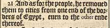 21 And as for the people, he remoued them to cities from one end of the borders of Egypt, euen to the other ende thereof.