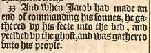 33 And when Iacob had made an end of commanding his sonnes, he gathered vp his feete into the bed, and yeelded vp the ghost, and was gathered vnto his people.