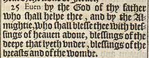 25 Euen by the God of thy father who shall helpe thee, and by the Almightie, who shall blesse thee with blessings of heauen aboue, blessings of the deepe that lyeth vnder, blessings of the breasts and of the wombe.