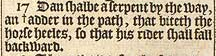 17 Dan shalbe a serpent by the way, an +adder in the path, that biteth the horse heeles, so that his rider shall fall backward. [ +Heb. an arrow-snake.]
