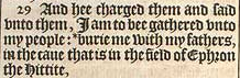 29 And hee charged them and said vnto them, I am to bee gathered vnto my people: *burie me with my fathers, in the caue that is in the field of Ephron the Hittite, [ *Chap.47. 30. ]