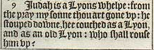 9 Iudah is a Lyons whelpe: from the pray my sonne thou art gone vp: he stouped downe, hee couched as a Lyon, and as an old Lyon: who shall rouse him vp?