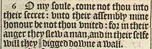6 O my soule, come not thou into their secret: vnto their assembly mine honour be not thou vnited: for in their anger they slew a man, and in their selfe will they || digged downe a wall. [ || Or houghed oxen. ]